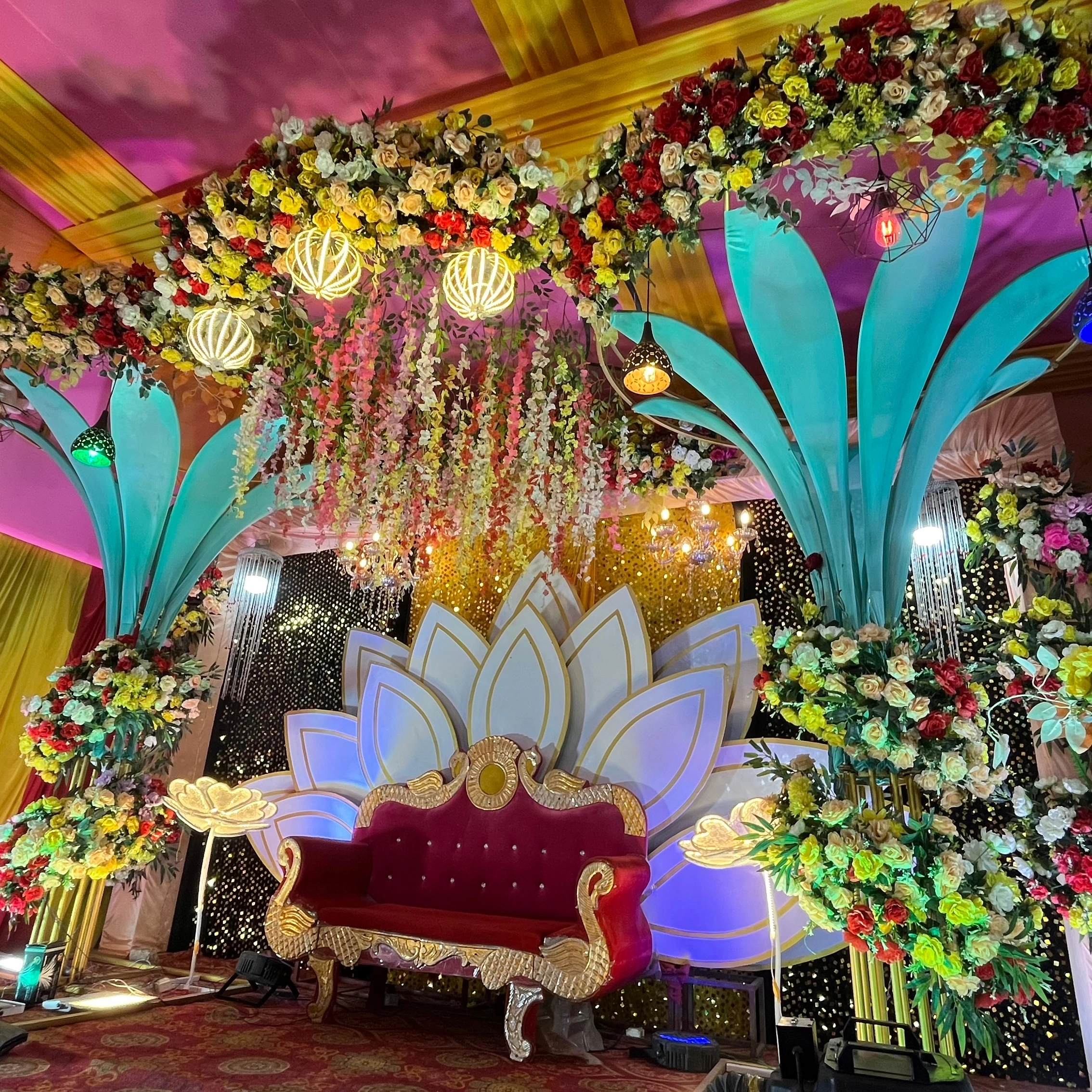 Grand wedding setups with floral arrangements, lighting, and mandap decoration.